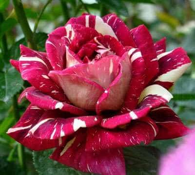 Главной особенностью цветков является то, что они могут в процессе распускания изменять окраску – белые штрихи на лепестках то увеличиваются, то уменьшаются в размерах. И это придает кусту определенный шарм. Листва имеет темный окрас и только оттеняет пестроту бутонов. Аромат цветков тонкий и очень приятный.