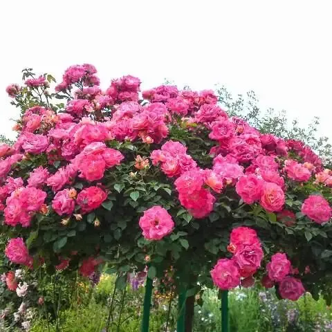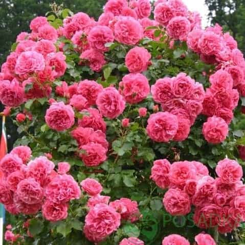 Роза штамбовая Четыре сезона 1.3 м. . Штамбовая роза Четыре сезона Les Quatre Saisons устойчива к болезням, вредителям и загрязнению окружающей среды, растет без пестицидов или лечения. Очень прочная листва, средние цветки (до 8 см.) с большим количеством лепестков (около 100 лепестков), устойчивы к дождю. Сорт Четыре сезона Les Quatre Saisons идеален для выращивания в штамбовой форме, т.к. выдает мощные длинные побеги, которые под тяжестью цветов ниспадают к земле, создавая эффект цветущего водопада. Густо-махровые ярко-розовые «фонарики» цветут в 2 устойчивые волны, но и между волнами деревце пустым не стоит, цветочки есть весь сезон. Штамб Четыре сезона Les Quatre Saisons, реализуемый в нашем питомнике в возрасте трёх лет имеет высоту около 2-х метров и объём кроны, сформированной двухстороний прививкой, около 60 см.