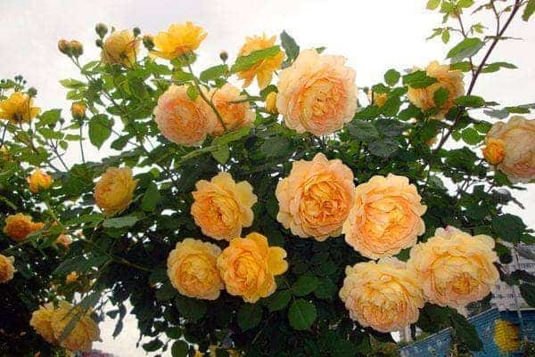 Великолепные цветки этой изумительной английской розы сочетают старинную форму с вполне современной окраской. Желтые с красным бутоны распускаются в густомахровые цветки 8-14 см в диаметре, с внутренними лепестками, образующими чашевидную форму, и отогнутыми внешними. Цвет обычно насыщенно яично-желтый, но могут появляться и персиковые или розовые тона, создавая медно-желтый оттенок. Цветки появляются в небольших кистях, часто поникают. Аромат легкий или средний, его описывают как пряный или фруктовый. Обильно цветет ранним летом, затем следуют быстро повторяющиеся волны повторного цветения до конца сезона. Побеги слегка или умеренно колючие, дуговидные, с блестящей ярко-зеленой листвой. Куст округлый, раскидистый, достигает 120-150 см высотой и столько же шириной в самом холодном климате, и до 180-200 см в жарких странах. Эта красивая роза будет хороша в миксбордере – попробуйте скомбинировать ее с лавандой или шалфеем. Устойчивость к болезням хорошая, хотя если черная пятнистость распространена в вашем регионе, лучше применять профилактику. (TGR)