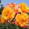 Роза Сахара кустарниковая, Тантау — цветки интересного оттенка золотисто-жёлтые с бронзово-красными штрихами, диаметром 8-9 см, махровые (27-34 широких лепестка), в соцветиях по 3-9 шт. Кусты компактные, прямые, хорошо разветвлённые. Листья слегка глянцевые, средне-зелёные, устойчивые к заболеваниям. Шипы шиловидные. Цветение обильное, повторное. Сорт зимостойкий.